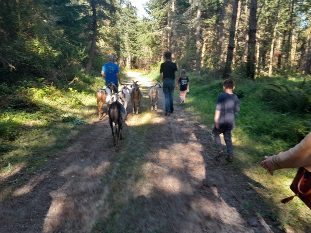Around 4 pm, 11 Camp PapaNanny campers and their guests gathered for the Goat Walk in the Trillium woods, with Dave Jacobson and 5 Nubian goats from the Blackberry Moon Farm. We entered this South Whidbey forest, at its best on a gorgeous day, and met with intimate contact from five goats who investigated each of us closely, while freely eating and eliminating. We, who knew nothing at all about goats, were graciously informed  by Dave, the goat guy, as to some of the basic attributes and ways of these gentle, interesting, social creatures. It was nothing at all like anything any of us had ever done before.